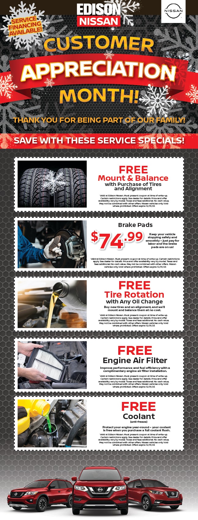 Expires December 31, 2025. Limit one coupon per customer. Coupon cannot be combined with other discounts, incentives, or internet pricing. Certain vehicle exclusions apply, see dealer. Cannot be applied towards prior purchases. Must print and present coupon prior to write up in order to qualify.